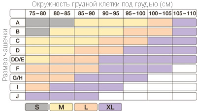 Шаг 4: Определить по таблице размеров, нужный размер, который находится на пересечении столбца, соответствующего Вашему обхвату грудной клетки и строки, соответствующей размеру Вашей чашки.